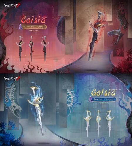 设计为匕首它将鸟类羽毛与缠绕的蛇骨错综复杂地结合在一起,创造出一种神秘而具有象征意义的美感。这种优雅而又充满威胁的设计完美地补充了艺妓的双重形态。
